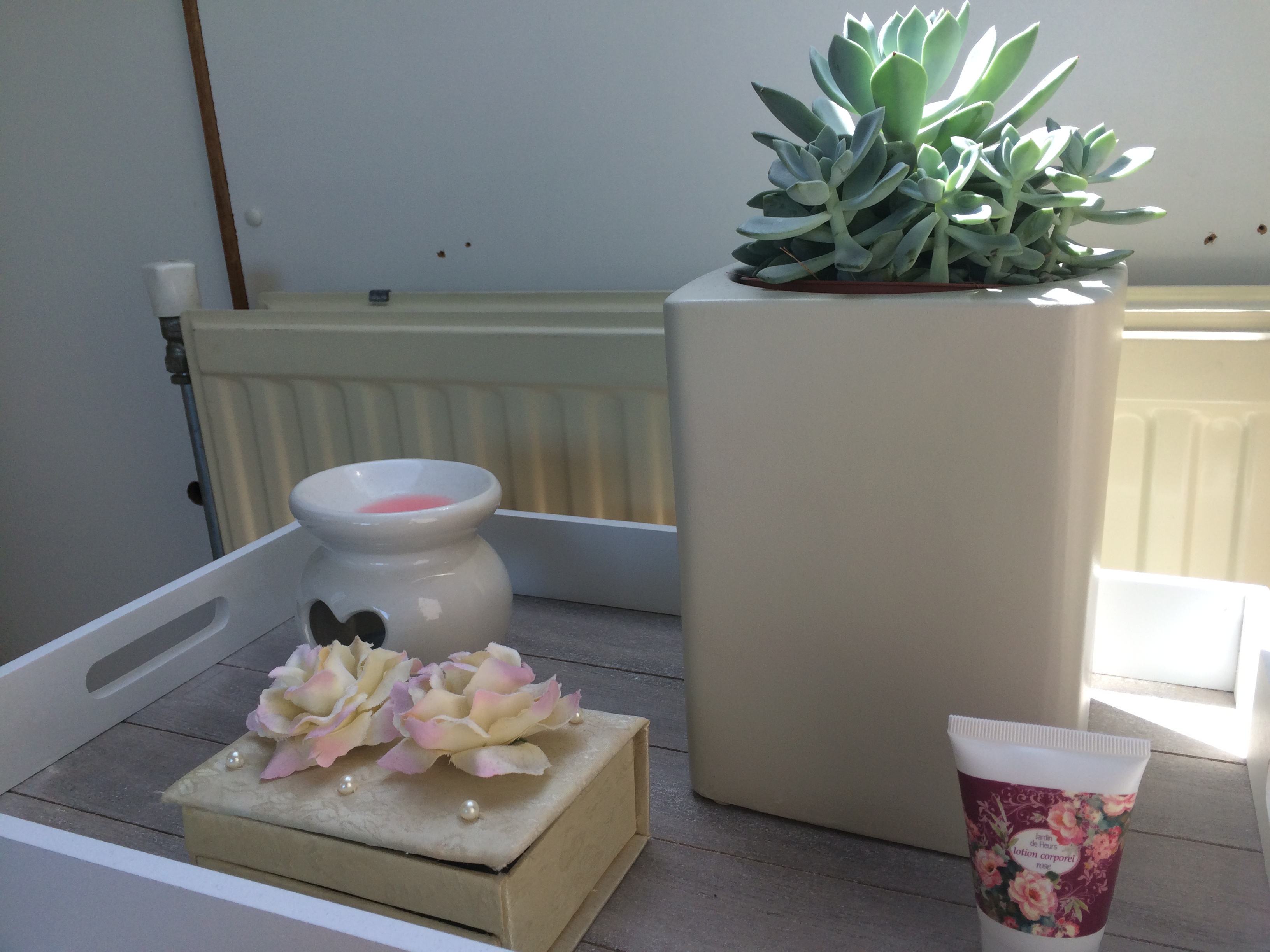 Als laatste heb ik rechts voorin een bodylotion staan die ik ooit in een pakketje kreeg. De bodylotion zelf is volgens mij al lang over datum, maar ik vind de verpakking zo mooi! De kleur past ook goed bij de wax tart in mijn geurbrandertje, en bij de bloemetjes van het sieradendoosje. 🙂
