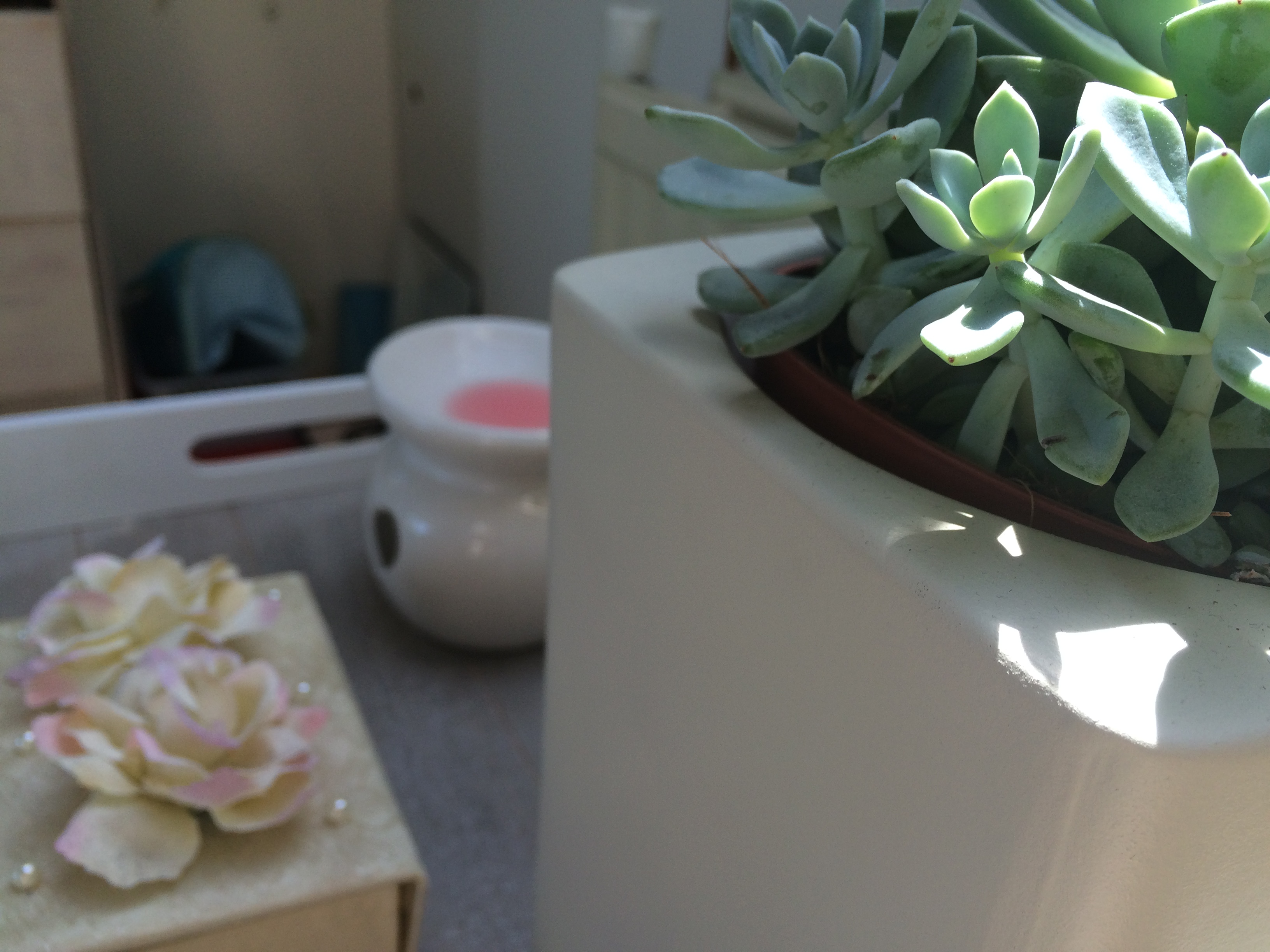 Rechtsachter staat een vetplantje die ik bij de Albert Heijn in de korting heb gekocht. Ik kocht hem eigenlijk meer voor het potje wat ik erbij kreeg, maar eigenlijk vind ik die vetplant ook ontzettend leuk staan! Voordeel: ze hebben heel weinig water nodig dus je hoeft niet bang te zijn dat ze verdorren.