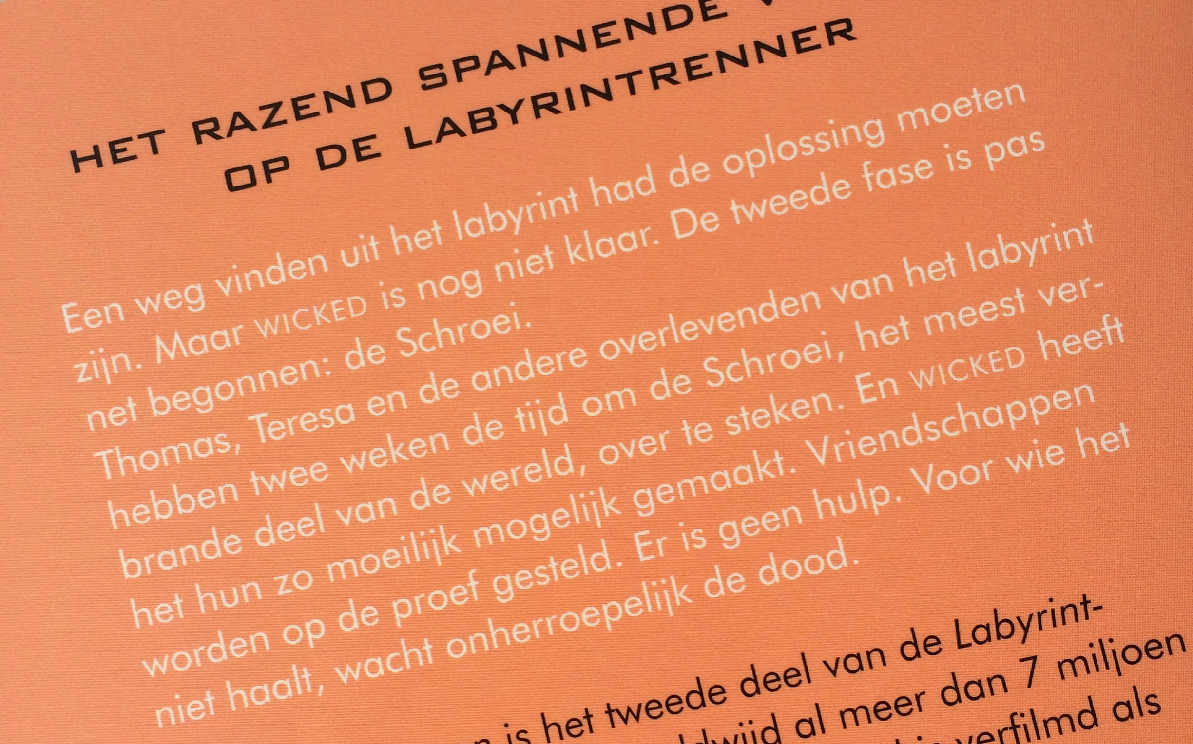 Toen ik De Labyrintrenner uit las, begon ik de dag erna gelijk in De Schroeiproeven omdat ik móést weten hoe het de Laarders verder zou vergaan. Meteen vanaf het eerste hoofdstuk was ik hooked. De Laarders krijgen één nacht rust, daarna beginnen alle verschrikkingen weer opnieuw, misschien nog wel gruwelijker dan de taferelen die ze in het labyrint moesten overwinnen.